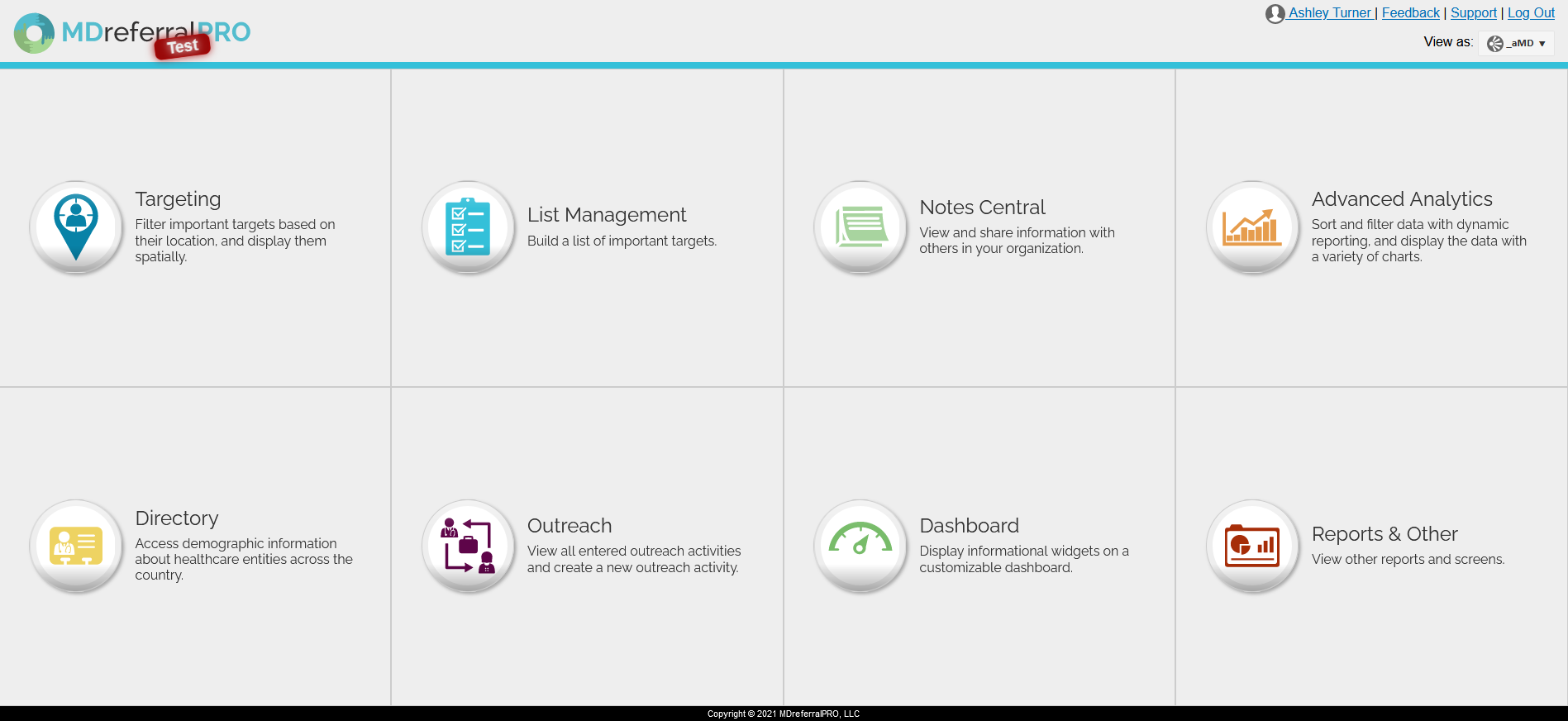 Once logged in, users will be directed to the MDreferralPRO Landing Page. This page allows users to select the desired Navigation Button of choice and make a viewpoint selection (if applicable).